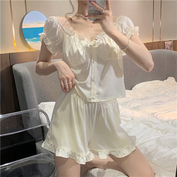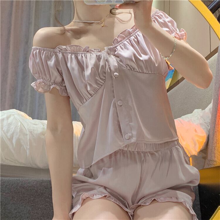 フリルをあしらったショルダーと裾が可愛らしさを引き立て、リラックスタイムを華やかに演出します。