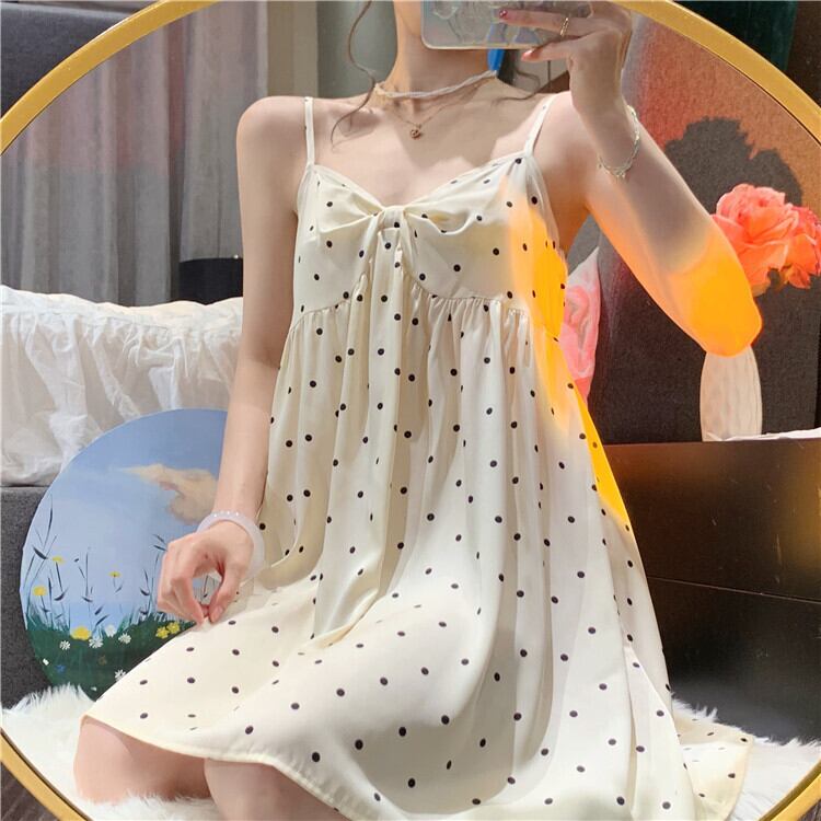 愛らしいドット柄が特徴の「ドット スリングネグリジェ」は、キャミワンピースとショート丈のトップス、ボトムスがセットになったルームウェアです。このアイテムは軽やかなデザインで、涼しさを感じながらリラックスした時間を楽しむことができます。
