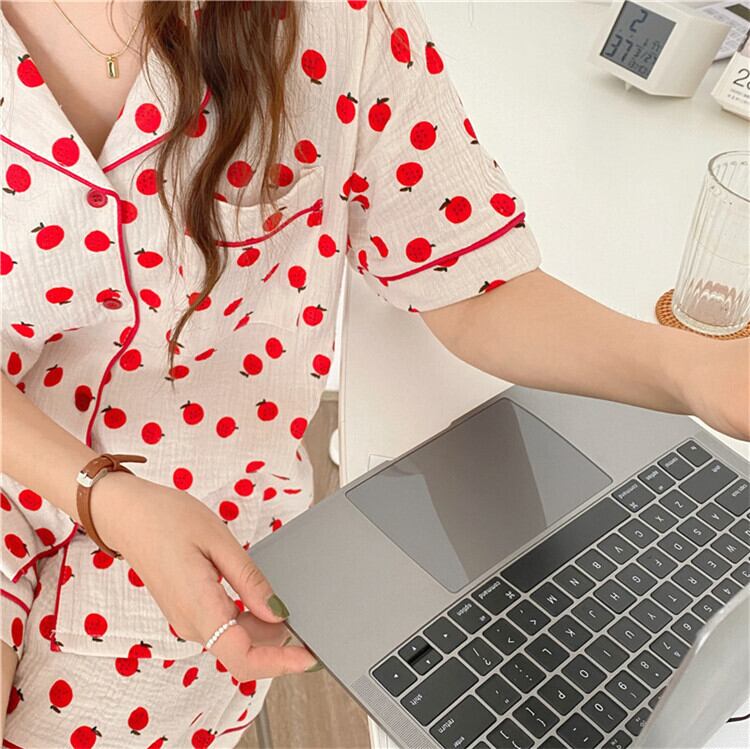 愛らしいリンゴ柄が特徴の「リンゴ柄のルームウェア」は、夏にぴったりのコットン素材で作られた薄手のアイテムです。このルームウェアは、軽やかで心地よいデザインが施されており、暑い季節にリラックスした時間を楽しむことができます。おうちでのんびり過ごす時や、友人とのカジュアルな集まりにも最適です!