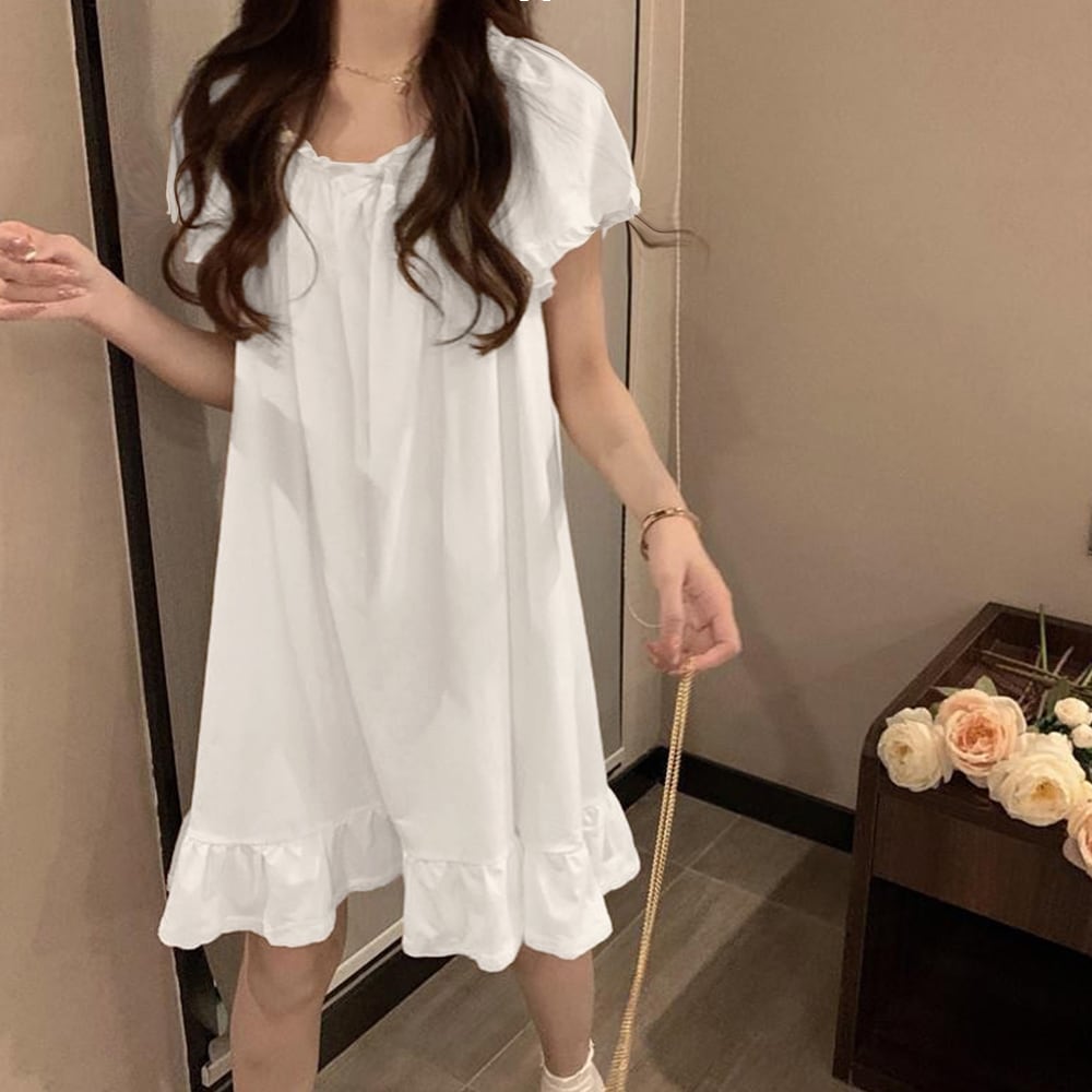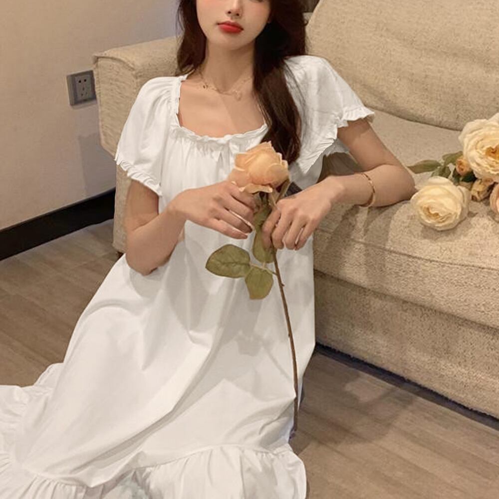 袖口と裾のフリルが可愛らしさを引き立て、スクエアネックがデコルテを美しく見せます。