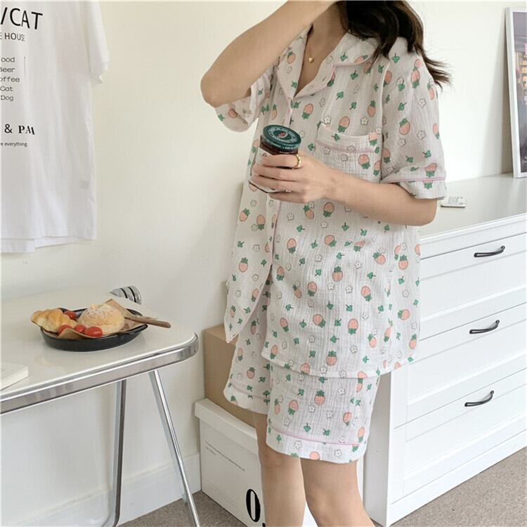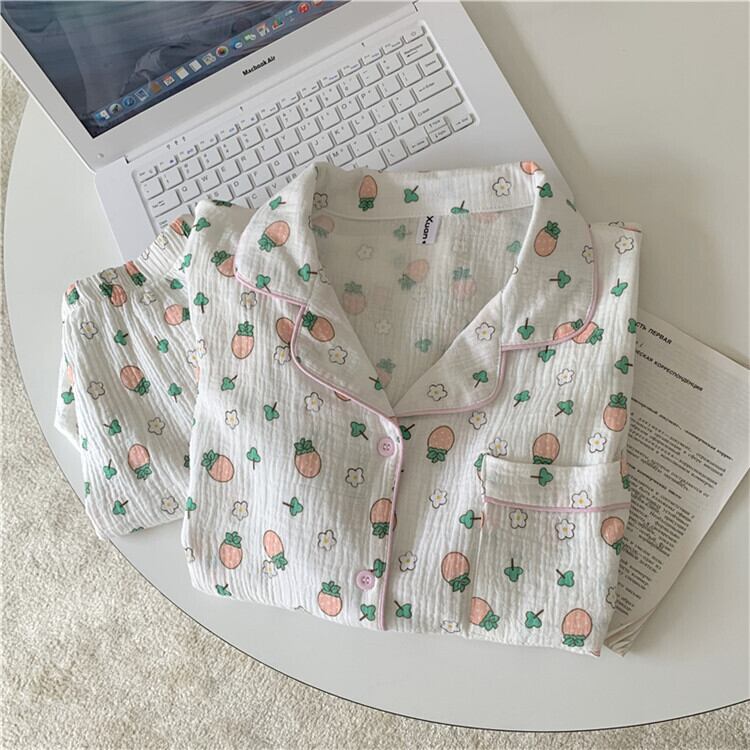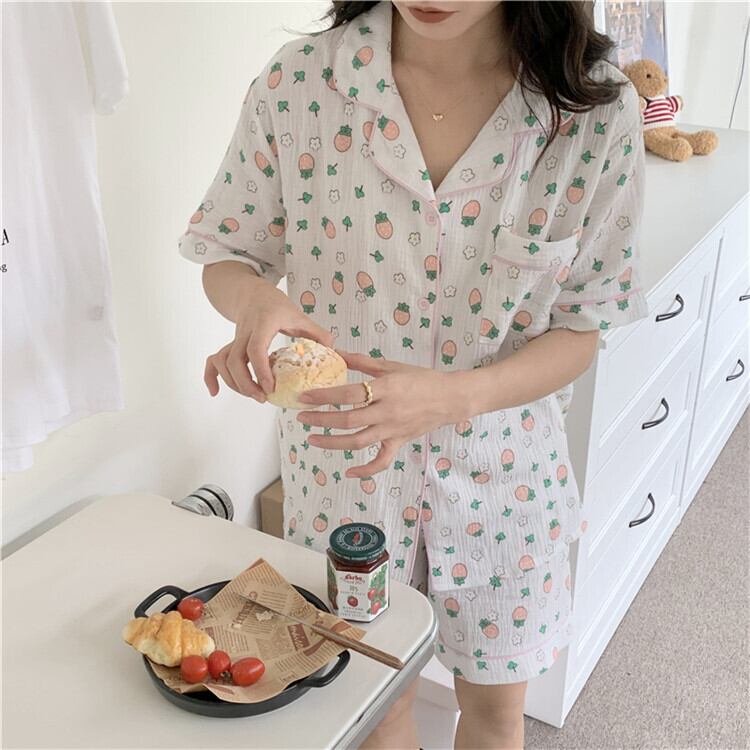 心をほっこりさせる「いちごのスイートパジャマ」で、甘い夢の世界へ。いちごや花、クローバーのデザインが一面に広がるこの可愛らしいパジャマは、まるでおとぎ話の中にいるような楽しい気分を演出します。お部屋でのリラックスタイムや、ゆったりとした眠りに最適な一着です。
