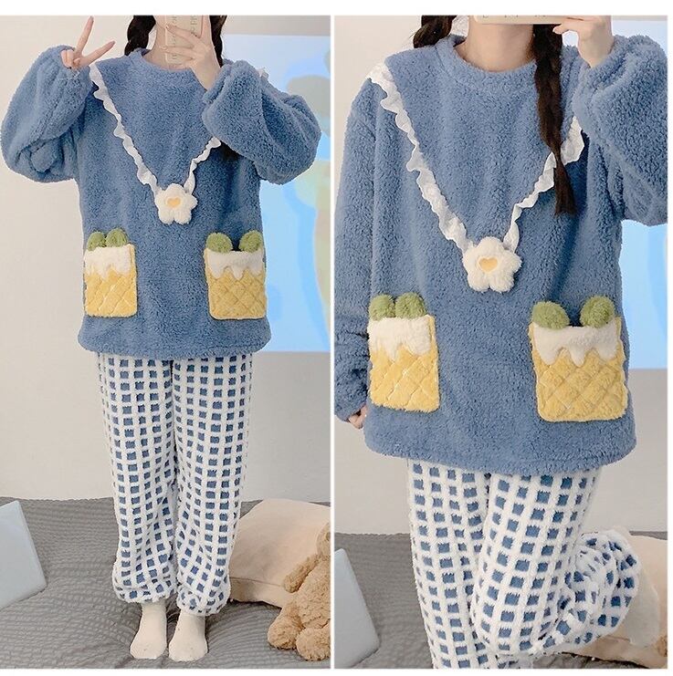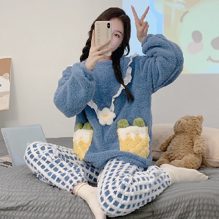 心温まる「お花のフランネルパジャマ」で、リラックスしたひとときをお楽しみください。お花がついた愛らしいトップスと、チェック柄のパンツが組み合わさったデザインは、かわいらしい雰囲気を演出し、就寝時はもちろん、ルームウェアとしても活躍するアイテムです。このパジャマを身にまとえば、毎日のナイトルーチンが特別なひとときに変わります!