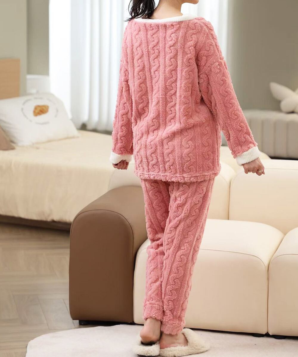 大人可愛いケーブル柄のふわふわフリース素材を使用した、秋冬にぴったりのもこもこルームウェアセットです。軽くて暖かい厚手生地で、寒い季節のおうち時間を心地よく過ごせます。