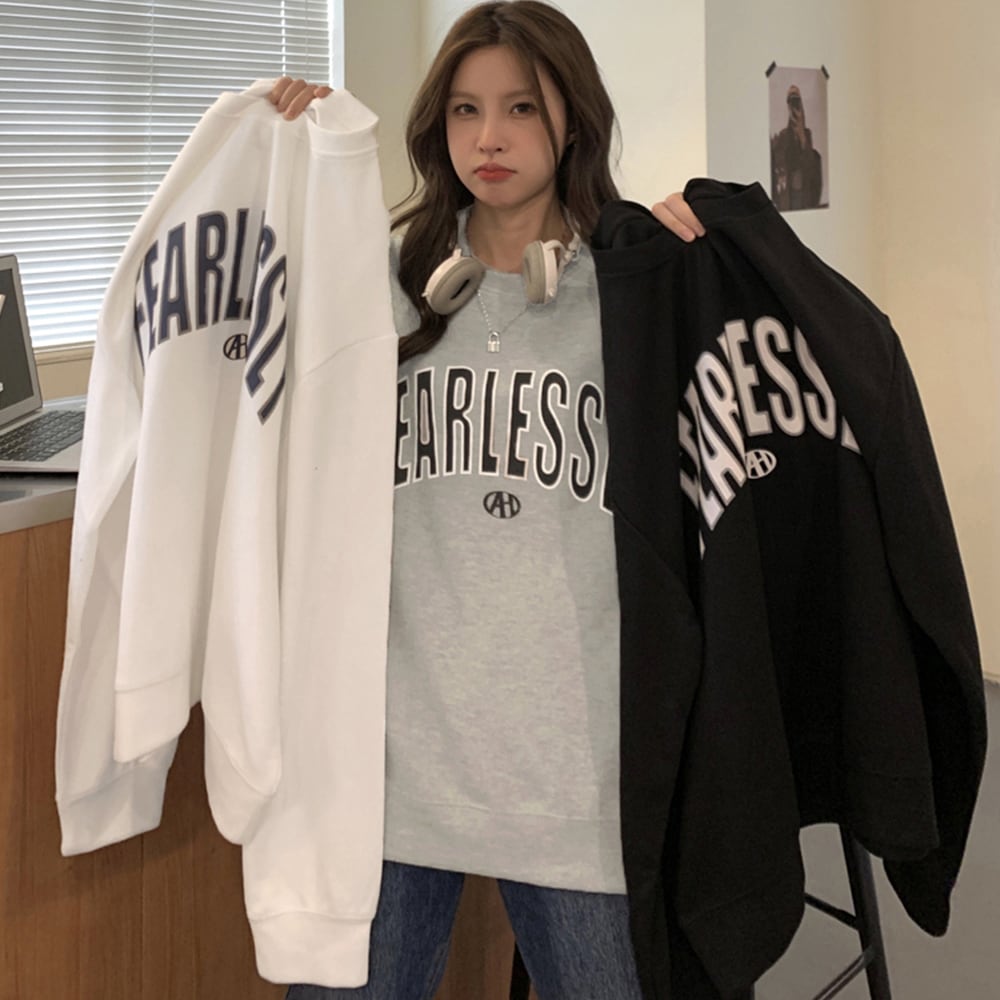 フロントに入った英字ロゴがポイントの、韓国風デザインのBF(ボーイフレンド)シルエットトレーナー。