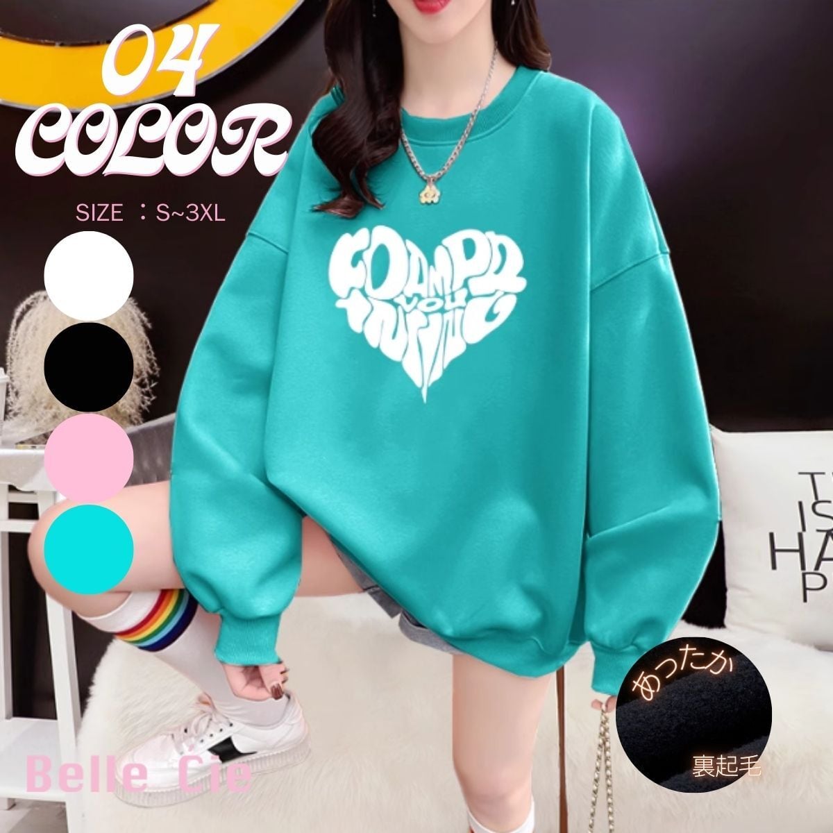 裏起毛素材さから、寒い日でもあたたかく快適に着られるトレーナー。ゆったりとしたコロンとしたシルエットがかわいらしく、重ね着しやすいクルーネックのシンプルデザインです。主張しすぎないハートロゴがさりげないアクセントになり、コーディネートに取り入れるだけでキュートな印象に。