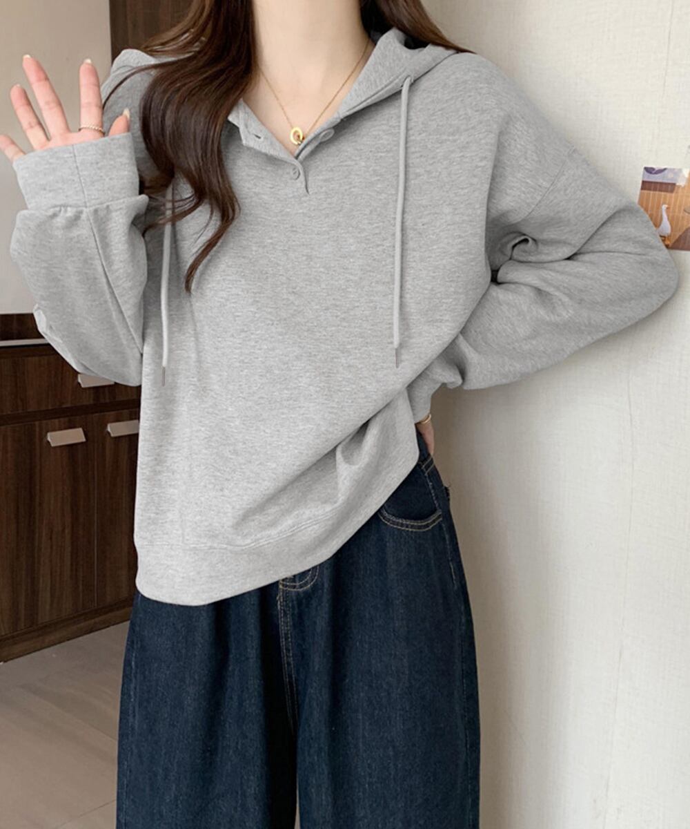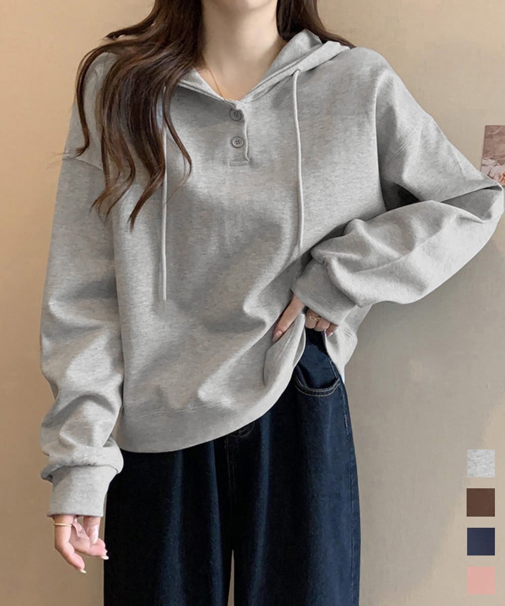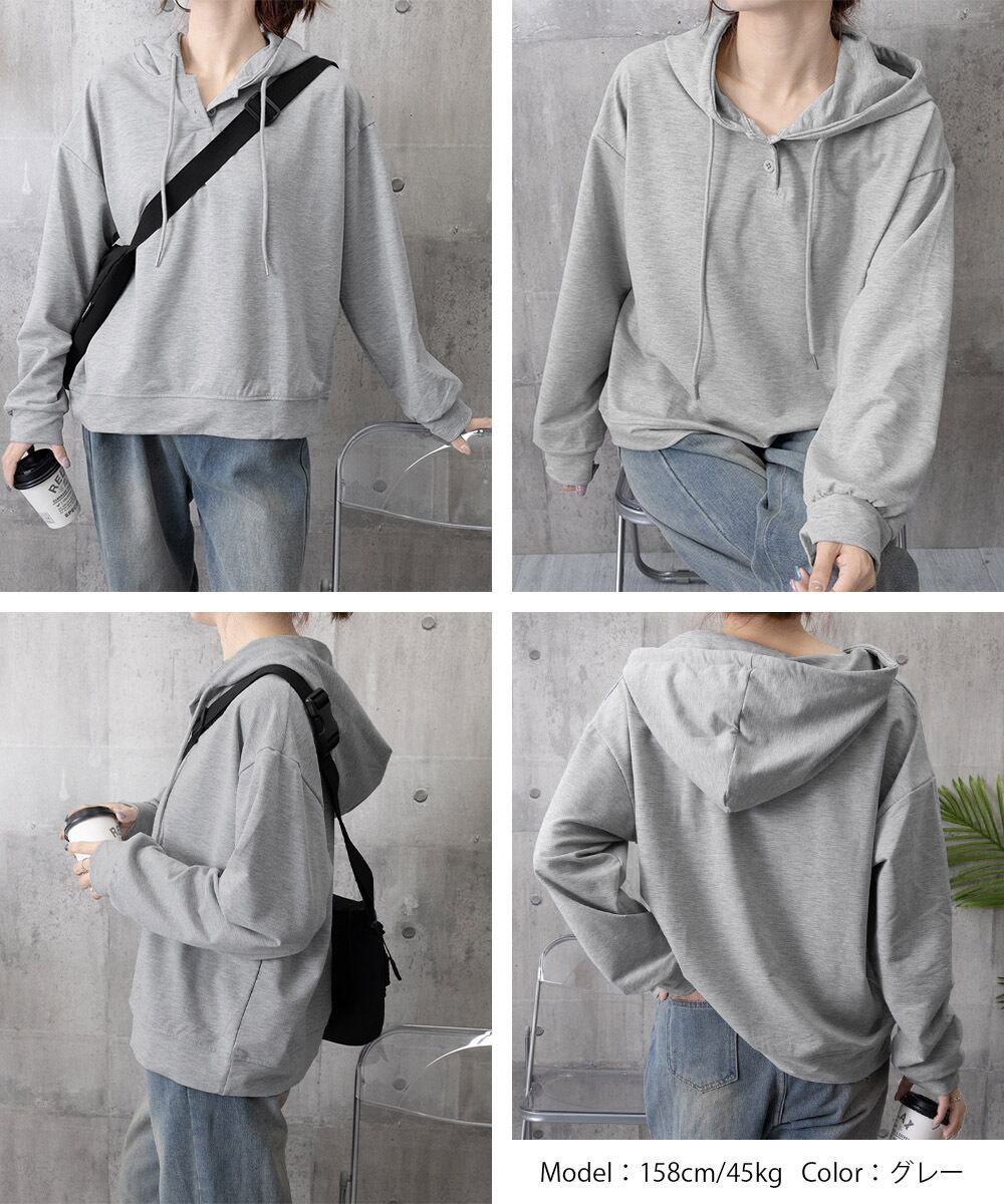 ゆったりシルエットでリラックス感のあるフードパーカー。長袖で軽やかな着心地なので、春や秋のデイリーコーデにぴったりです。体型カバーも叶えつつ、シンプルなデザインでカジュアルにおしゃれを楽しめます。おうちでのくつろぎタイムやちょっとしたお出かけまで、幅広く活躍する一枚です。