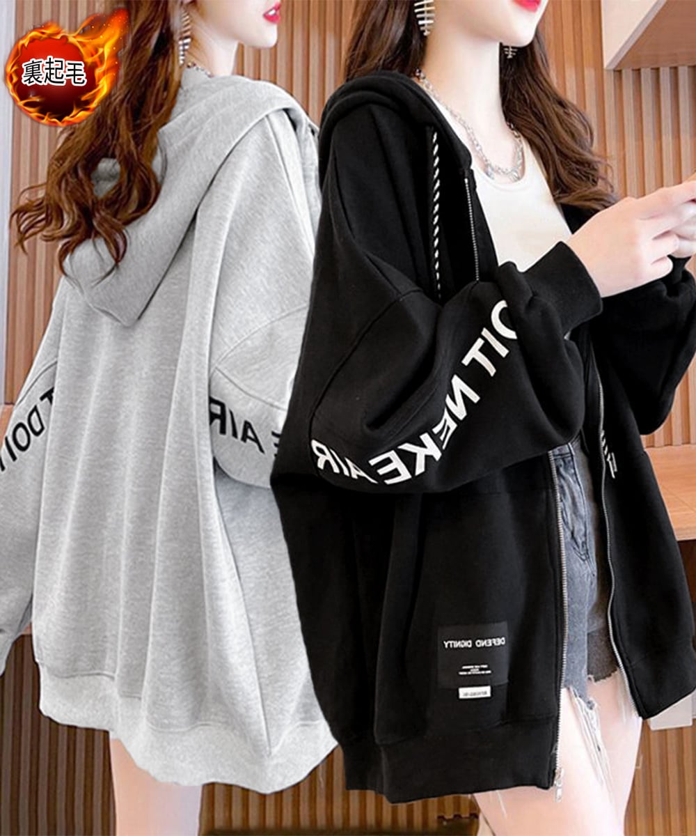 裏起毛で暖かいロング丈のフード付きスウェットパーカー。