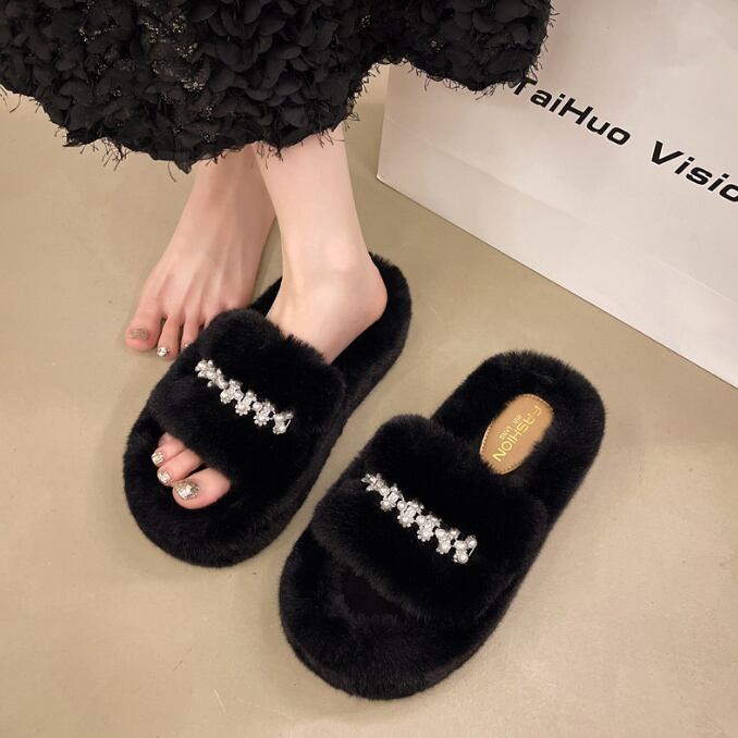 キラッと輝くビジューが映える ふわもこファーサンダル