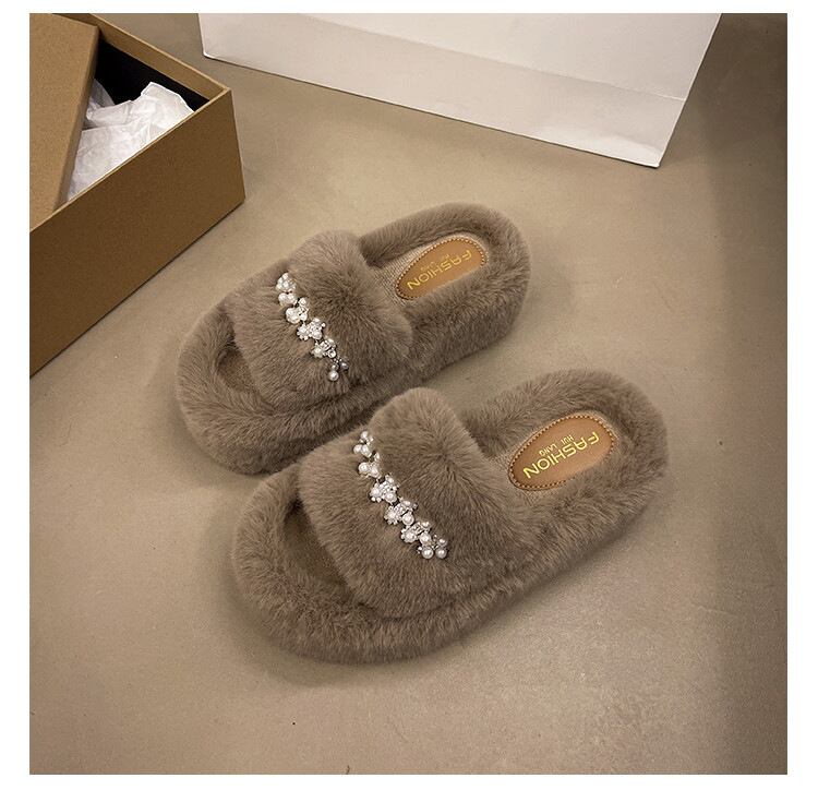 秋冬コーデに映えるふわもこファーサンダル。柔らかなフェイクファーとビジューデザインで足元を華やかに演出します。6cmソールでスタイルアップしつつ、フラットで歩きやすいのも魅力。滑り止め付きで安心して使え、室内用にもおすすめのトレンドアイテムです。